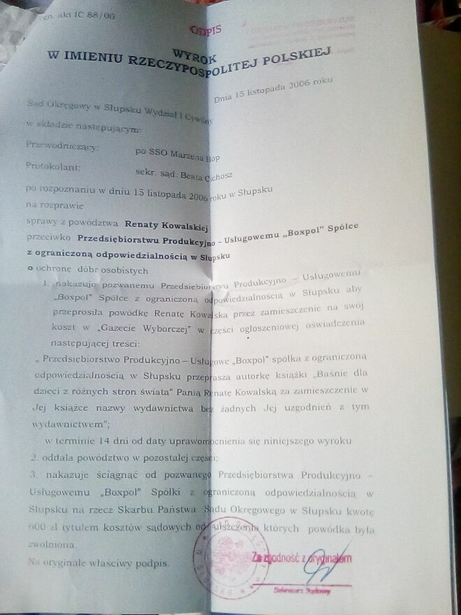 Informuję i oświadczam, że autorem i wydawcą książki "Baśnie dla dzieci z różnych stron świata" wyd. w Słupsku w 2005 roku jestem ja, Renata Kowalska, a z instytucją, której nazwa jako rzekomego wydawcy znalazła się w mojej książce , nie miałam nic wspólnego. W załączniku (zdjęcie) Wyrok Sądu w Słupsku nakazującego przeproszenie mnie za zamieszczenie w mojej książce nazwy wydawcy, z którym nie miałam jakiejkolwiek umowy i który nie był mi znany.Renata Kowalska
