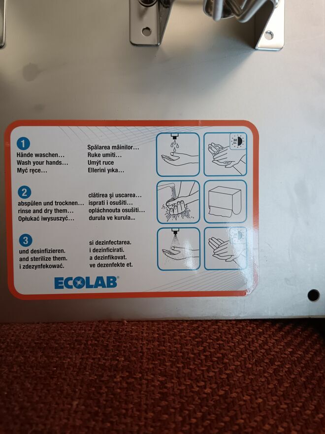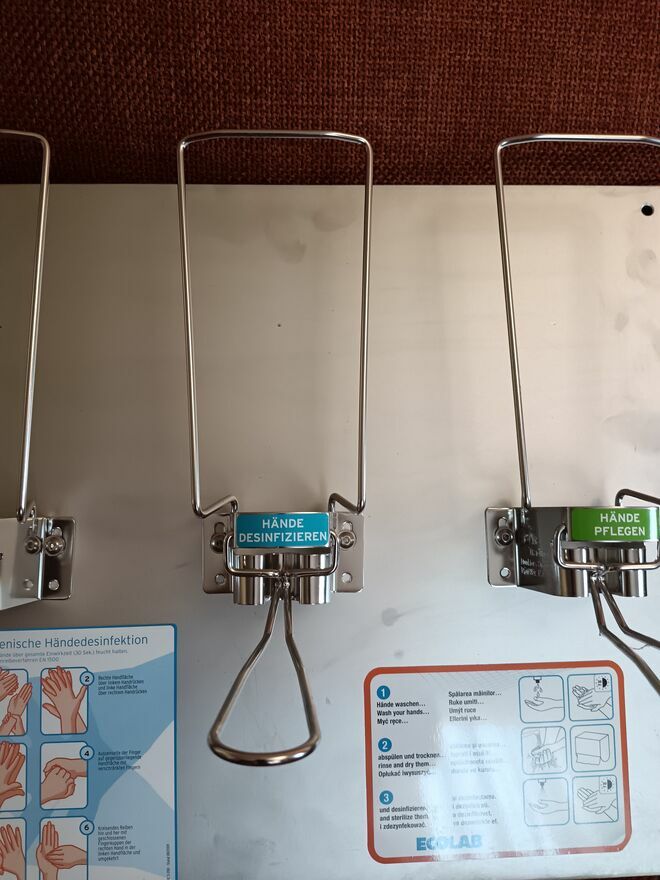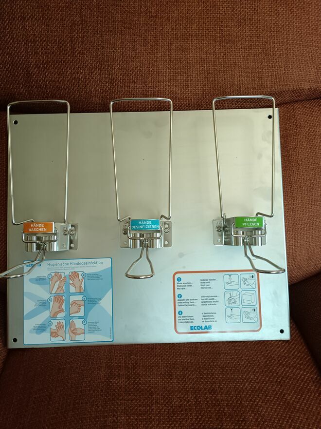 Stacja do higieny rąk przedstawiona na zdjęciu to profesjonalny zestaw ścienny firmy Ecolab wykonany że stali nierdzewnej, najczęściej spotykany w placówkach medycznych, domach opieki oraz przemyśle spożywczym. Składa się on z metalowej płyty montażowej oraz trzech manualnych dozowników przeznaczonych na butelki 500 ml lub 1000 ml.Tomasz